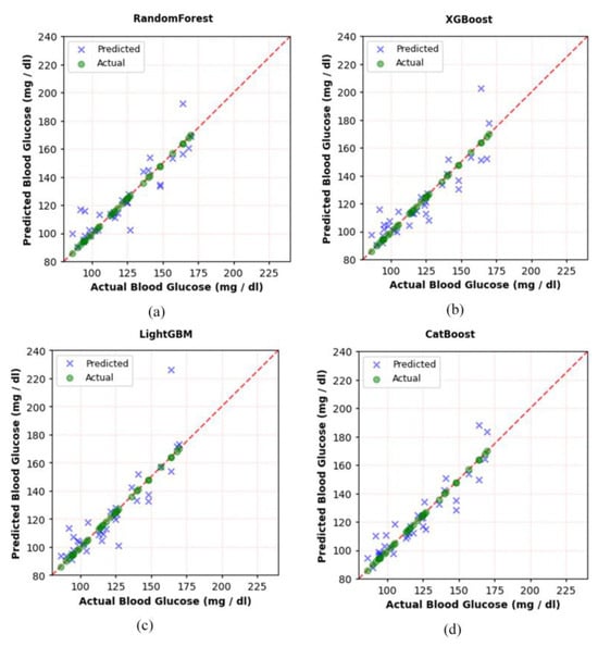 A scatter diagram of the predicted and actual (reference) glucose level values using 50 features obtained by combining PPG waveform-based features with IMFs-based features is shown in Figure 8. The scatter plots in Figure 8 compare the performance of four machine learning models (RF, XGBoost, LightGBM, CatBoost) in predicting blood glucose levels. The RF model shows variability, especially at lower glucose values. XGBoost demonstrates higher accuracy, notably in lower glucose ranges. LightGBM exhibits some accuracy but with notable deviation in high glucose level. CatBoost, however, displays most predictions closely aligned with the ideal line indicating superior accuracy in its predictions.