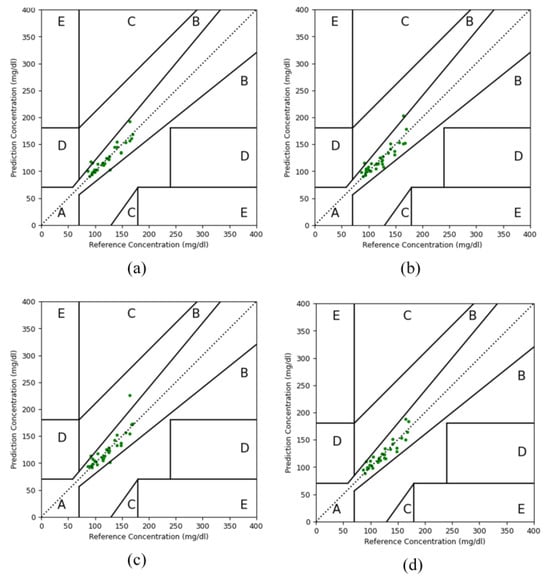 The commonly utilized Clarke’s error grid analysis (EGA) has been carried out to confirm the clinical safety of the proposed noninvasive blood glucose estimation method. Figure 9 displays the EGA plot with selected features. In the EGA, Zone A represents the values within 20% of the reference sensor. Zone B contains points that are outside of 20% but would not lead to inappropriate treatment. Zone C are those points leading to unnecessary treatment. Zone D are those points indicating a potentially dangerous failure to detect hypoglycemia or hyperglycemia. Zone E are those points that would confuse treatment of hypoglycemia for hyperglycemia. And the green dots in the EGA represent data points. Most of the data points in case of RF, XGB, and LightGBM are in zone A, while a very small percentage of data are in zone B. In this analysis, especially CatBoost, all data points exist in zone A, supporting the better accuracy and reliability of the method proposed in this study.
