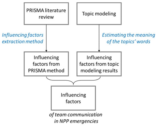 We collected the influencing factors of team communication in NPP emergencies by performing and analyzing the results of a literature review and text mining. For the literature review, we partly followed the PRISMA method [34], and the papers assessed for eligibility were limited to the NPP domain. To compensate for this limitation, text mining was carried out on the entire set of reference papers. From the papers selected with the PRISMA method, we extracted the main research findings and, from the topics obtained from text mining, we estimated the meaning of the words into reasonable terms related to the research topic. The results were combined to create a list of influencing factors of team communication in NPP emergencies (Figure 1). The methodology of extracting the influencing factors from the literature review and topic modeling is organized as follows.