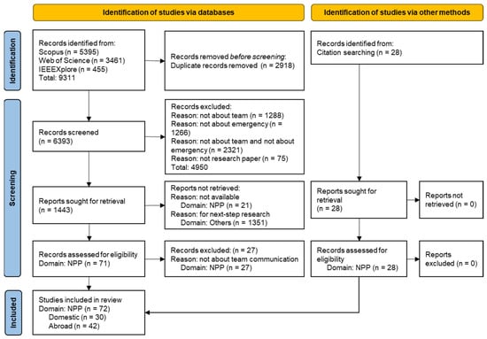 Next, we proceeded to screen each paper. Upon reading the title and abstract, we excluded the papers that (1) neither analyzed a team nor an emergency, (2) considered an emergency but not at the team level, (3) analyzed a team but not during an emergency, and (4) was not a research paper. Then, we identified each paper’s application domains and selected those on the NPP domain. In the end, we selected 72 reference papers (Figure 2).