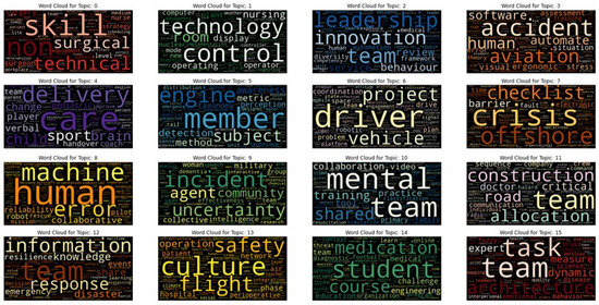 The document–word matrix was converted into two matrices: a document–topic matrix and a topic–word matrix; thus, a discrete number of topics was required. Using the coherence score of [62] from tmtoolkit [63], we calculated the optimal number of topics. The highest and second highest coherence scores were obtained for 6 and 16 topics, respectively, and we decided on 16 topics. Then, LDA was used to populate the document–topic matrix and the topic–word matrix. Using the topic–word matrix, we obtained the list of words in the 16 topics (Figure 4). We did not perceive the need to name the topic, which is a difficult task [64]; instead, we proceeded with analyzing the words in a topic to extract plausible influencing factors.