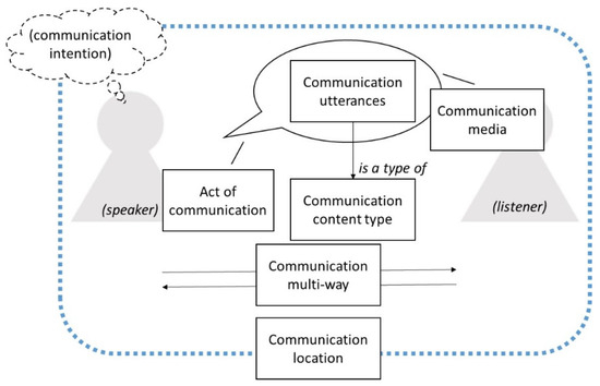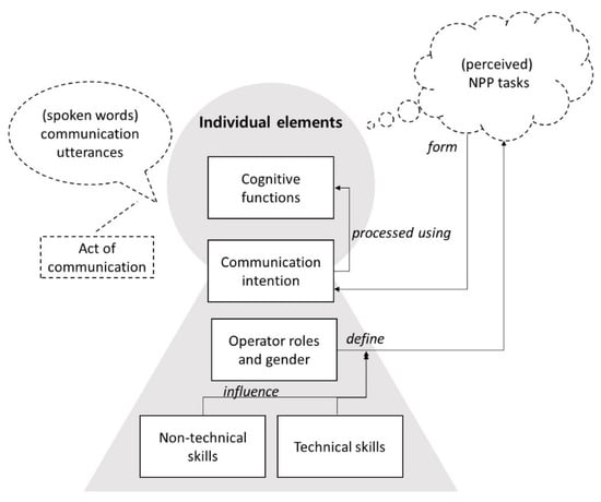 Communication intention refers to the intention of an individual who starts a conversation; this intention may or may not be perceived as it was intended by the listener (related to the cognitive functions “intent formation and intent interpretation”). Communication intention is known by the speaker, and when it is spoken, it becomes a “communication utterance”, and the speaker engages in an “act of communication” (communication elements). This is an example of relations between individual sub-elements and other sub-elements (Figure 5). Included in the communication intentions are those related to NPP tasks as well as common intentions, such as agreement/disagreement and handing over responsibility [24,68,69].