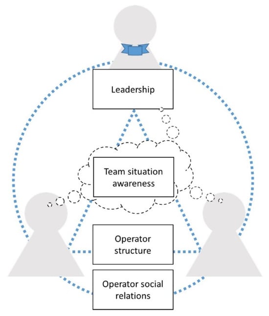 Team elements contain influencing factors that emerged from the “working as a team” setting. An illustration of relations between team sub-elements is shown in Figure 6, where the operators are connected through the operator structure by regulations and by social relations, leadership is the property of a leader, and all members maintain team situation awareness.