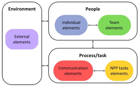 The NPP event analysis mostly contains the performance categories of [70] and the data analysis method of [71]. We created this sub-element because the influencing factors are related to each other (with a certain event as the connector). Also, an NPP event such as an accident triggers countermeasure tasks that are different from routine tasks. These tasks further cause the need for team communication in emergencies.