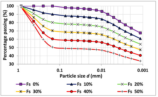 To achieve the research objective, expansive clay soil was excavated from Demsarkho-Lattakia at a depth of 3 m from the ground level, surpassing the backfill soils to access the targeted soil layer. Fine-grained marine sand was used for mixing with the expansive clay, which was washed to eliminate fine particles and obtain clean sand suitable for experiments. Mixtures were prepared by adding different percentages of sand (10%, 20%, 30%, 40%, and 50%) to the expansive soils based on the dry weight. To determine the grain size distribution, experiments were conducted using the dry sieving method for fine sand and hydrometer sedimentation for clay soil according to ASTM standards [59,60]. Figure 1 illustrates the granular gradient curves of the mixed soil, based on the percentage of sand added to it. Specific weight tests were carried out in accordance with ASTM D854-98 [61], revealing a specific gravity of 2.7 for the expansive clay and 2.65 for the sand. The chemical composition of clay has been listed in Table 1.