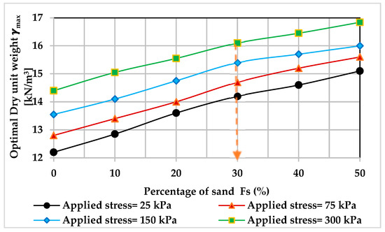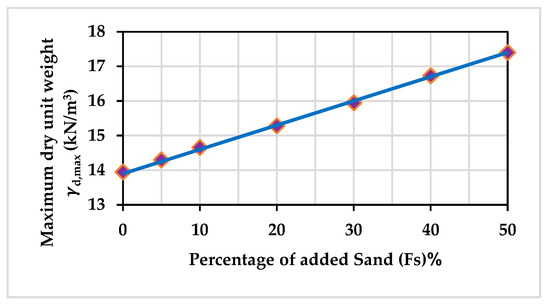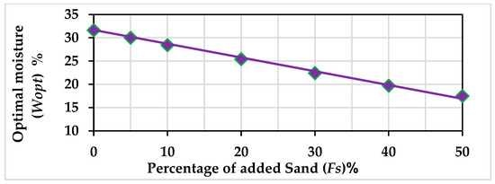 Standard proctor experiments were carried out to determine the maximum dry unit weight and optimal moisture for each mixing percentage, as illustrated in Figure 3 and Figure 4. The results indicate a continuous increase in the maximum dry unit weight, which is consistent with the findings of previous studies [63,70]. This can be attributed to the reduction in soil pore volume and suction stress resulting from the replacement of a soft component, which can hold a large amount of water, with a coarse component that has a low water-holding capacity. This is further supported by the optimal moisture values of the mixtures, which decrease as the percentage of added sand increases, as shown in Figure 4. For more details on the Proctor, Atterberg, and consolidation tests, see Alnmr and Ray [71].