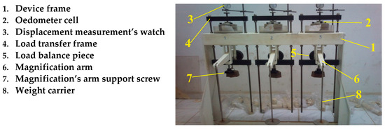 After meticulous sample preparation, as illustrated in Figure 5, filter papers were inserted both above and below the soil sample to prevent the ingress of fine soil particles into the porous discs’ interstices. Subsequently, a loading cap was installed atop the upper porous disc, and the entirety of this composite assembly was carefully positioned within the oedometer cell. Finally, the load transfer frame was installed onto the loading cap, as exemplified in Figure 7. The specimens were subjected to varying stress levels (25, 75, 150, 300 kPa). Afterwards, the specimens underwent immersion in distilled water, inducing swelling or settlement contingent upon the initial conditions and applied stress. Following the attainment of equilibrium in deformation, the swelling amplitude was meticulously recorded for each applied stress.