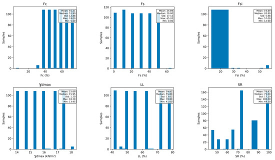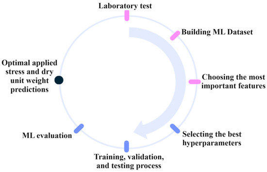 Based on the results of the experiments, a dataset of 657 unconfined compression tests was created for use in developed machine learning models. The input data include: liquid limit (LL), clay content (Fc), silt content (Fsi), sand content (Fs), specific degree of saturation (SR), maximum dry unit weight () of proctor test, applied stress (), and dry unit weight (), This dataset is used to predict the optimal applied stress () and optimal dry unit weight (). The key steps of the applied methodology are depicted in Figure 8. Figure 9 displays the distribution histograms and density plots for the dataset.
