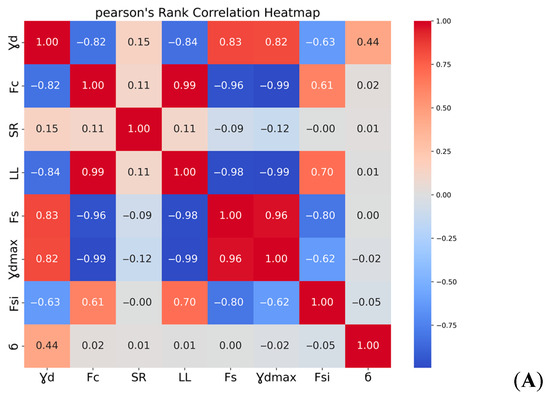 The final selection criteria are removing variables that are difficult to collect and choosing data that are easily accessible. The Pearson, Kendall, and Spearman correlation coefficients are computed among various parameters in this study to investigate the correlation between input and output parameters, as shown in Figure 10. The correlation between factors is represented by values of 0, 1, and −1, with 1 representing a strong positive connection and −1 representing a significant negative correlation. When the three approaches (Pearson, Kendall, and Spearman) were compared across different datasets and inputs, the variable, consistently had the highest correlation with applied stress (. Whatever the makeup of the dataset or the underlying assumptions of each correlation approach, this consistent pattern indicates a solid and robust link between and . As a result, these two parameters, as well as LL, , and SR, were chosen as inputs due to their importance in soil categorization and ease of assessment via simple experiments. Table 2 displays the statistical properties of the variables chosen. Table 3 shows the inputs and output boundaries for the developed models.
