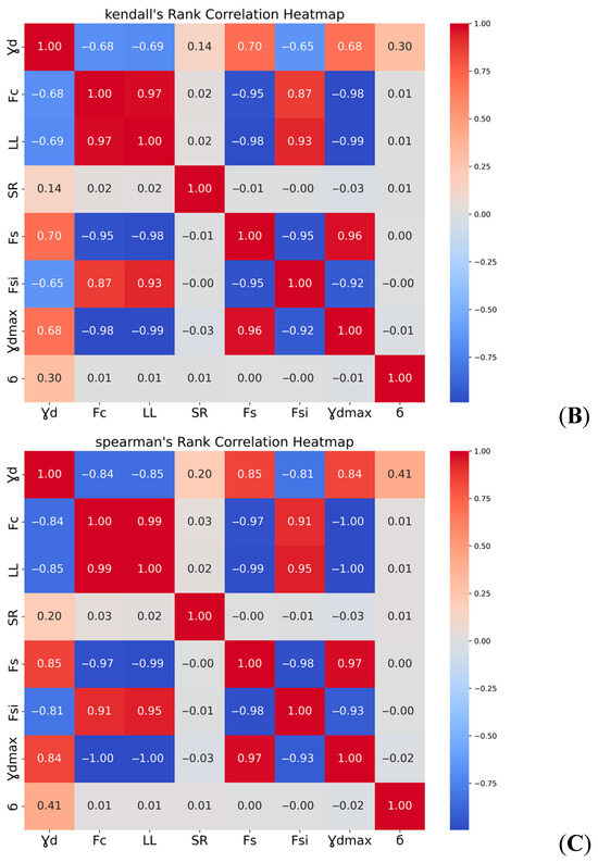 Correlation coefficients used to examine the influence of various input parameters on ‘qu’ and ‘Et’; (A) Pearson, (B) Kendall, (C) Spearman.