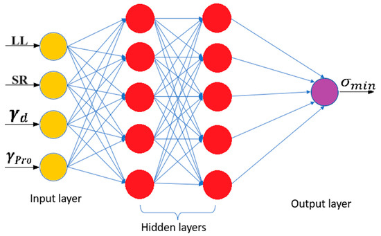 Artificial neural networks (ANN) constitute a computational framework comprised of artificial neurons designed to mimic information transfer processes akin to the human brain, enabling knowledge acquisition. They create sophisticated input–output models capable of discerning intricate relationships within multidimensional data, finding applications across various engineering disciplines [80,81]. ANN displays diverse network configurations, encompassing single and multiple layers. For instance, the feedforward back propagation neural network (FFBP) features an input layer for data reception, an intermediate hidden layer, and culminates in an output layer providing outcome-specific insights in response to input stimuli. Key hyperparameters governing the performance of ANN models include learning_rate, batch size, hidden layers function, and linkage between the hidden layer and the ultimate output layer function. The learning_rate determines the step size during optimization, influencing the convergence speed and model stability. Batch size regulates the number of samples processed before updating model parameters, impacting both computational efficiency and model generalization. The choice of the hidden layers function dictates the activation function applied to neurons within the hidden layers, shaping the network’s ability to capture complex patterns. The linkage function between the hidden layer and the ultimate output layer is pivotal in defining how information flows through the network, determining the model’s capacity to map inputs to accurate outputs. Figure 11 depicts an ANN model with four neurons in the input layer, two hidden layers with five neurons in each, and an output layer.
