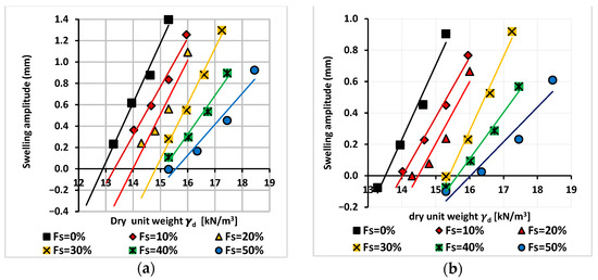 The findings presented in Figure 6, specific to initial conditions (Fs = 10%, = 14.66 kN/m3, SR = 75%), revealed a distinctive swelling pressure of 232 kPa. This observation signifies that, under these specified initial conditions, the optimal dry unit weight of 14.66 kPa should align with an applied stress of 232 kPa to achieve a swelling amplitude of 0. Correspondingly, for = 14.66 kN/m3, the optimal applied stress for these specific initial conditions was determined to be 232 kPa. These outcomes contribute significantly to our understanding of the complex interplay between initial conditions, optimal applied stress, and optimal dry unit weight in expansive soils.