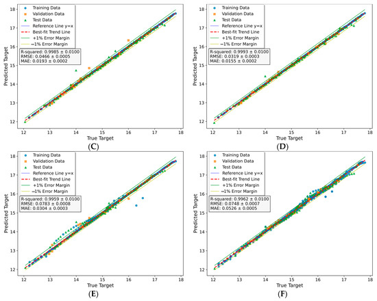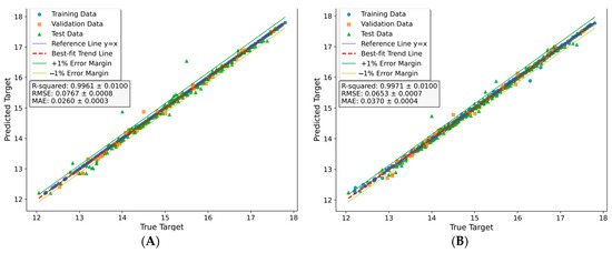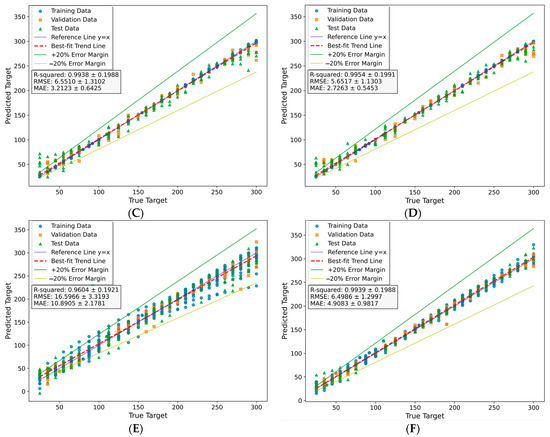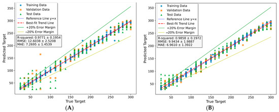 During the training, validation, and testing process of the models, the performance was evaluated by calculating the root mean square error (RMSE) (Equation (1)), mean absolute error (MAE) (Equation (2)), and the coefficient of determination (R2) (Equation (3)). The RMSE is the root of average squared difference between the predicted outputs and the actual targets, where a lower RMSE value indicates better performance. On the other hand, the correlation coefficient (R), which is the square root of the coefficient of determination, measures the degree of correspondence between the predicted outputs and the actual targets. A value of R close to 1 indicates a more accurate estimation.