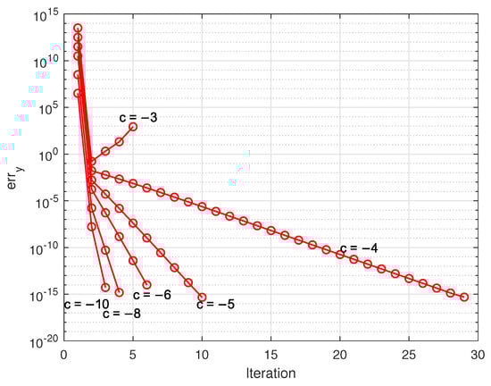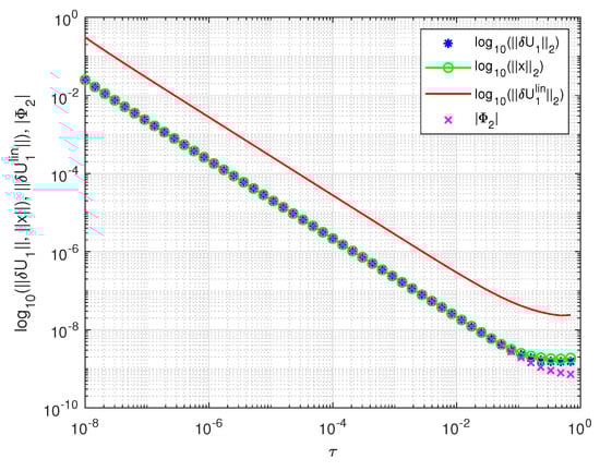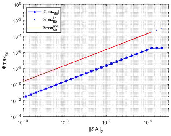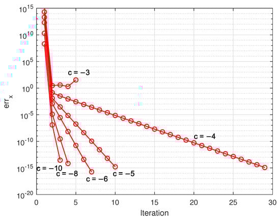 Consider a matrix, taken aswhere , the matrices and are constructed as proposed in [34],and the matrices are Householder reflections. The condition numbers of and with respect to the inversion are controlled by the variables σ and τ and are equal to and , respectively. In the given case, , and . The minimum singular value of the matrix A is . The perturbation of A is taken as , where c is a negative number and is a matrix with random entries generated by the MATLAB®functionrand.