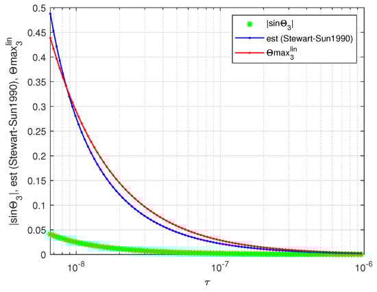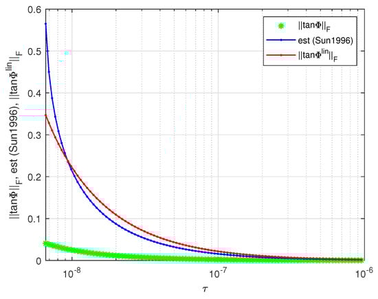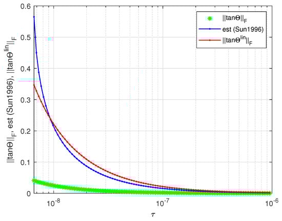For the matrix A and the perturbation E given in the previous example, compare first the sensitivity of the singular vector associated with the minimum singular value of A with the respective estimate of presented in [Example 2, p. 267] [5]. In Figure 7, we show the exact value of , the estimate given in [5], and the linear estimate derived in this paper as functions of the parameter τ. (The estimate from [5] is valid for .) Both estimates are very close for all values of τ. Compare now the sensitivity of the left and right singular subspaces for the same matrix, with the bounds derived in [13] and the nonlinear estimates obtained in this paper. Since the estimates in [13] require knowing the norms of parts of the exact perturbation , these norms are substituted by for a fair comparison. In Figure 8, we show the exact value of , the respective estimate from [13], and the estimate , where and are the canonical angles between and . The corresponding comparison of the exact value of with the estimate from [13] and the estimate is given in Figure 9. It is seen from the figures that for values of τ between and the estimates from [13] produce slightly better results, but for values of τ less than , these estimates exceed significantly the nonlinear estimates obtained in this paper. (Note that the estimates derived in [13] are valid for The comparison of the estimates shows that in case of ill conditioned problems (small values of τ) the bound presented in this paper is less conservative than the estimate given in [13]. Example 4. This example illustrates the properties of the linear and nonlinear perturbation bounds obtained in the paper.