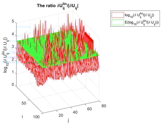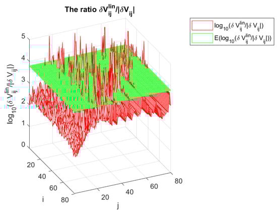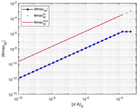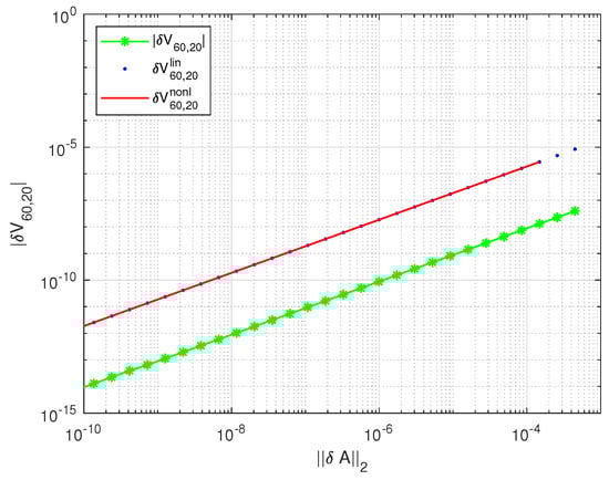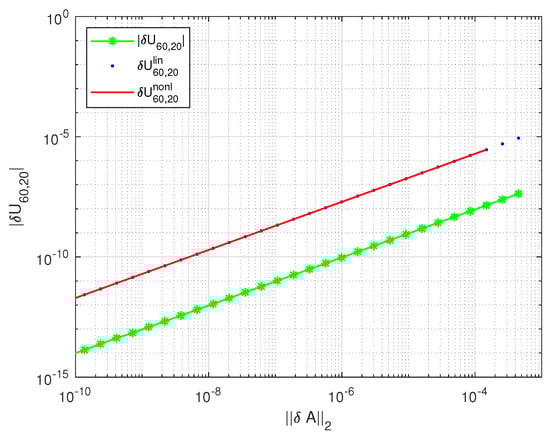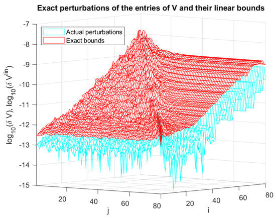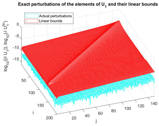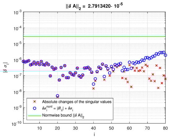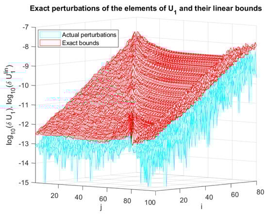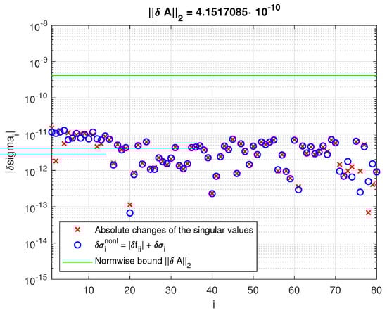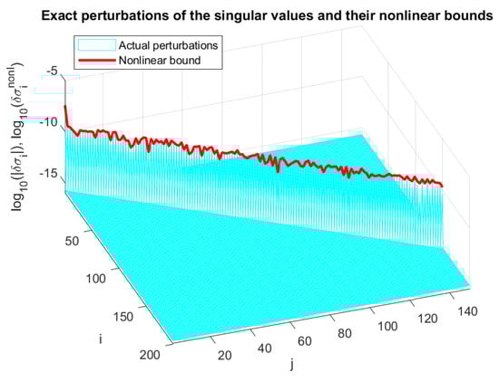 In Figure 10, Figure 11, Figure 12, Figure 13, Figure 14 and Figure 15, we show several results related to the perturbations of the singular value decomposition of A for 30 values of c between and . As particular examples, in Figure 10 we display the perturbations of the entry , which is an element of the matrix , and in Figure 11, we display the perturbations of the entry , both as functions of . The componentwise linear bounds correctly reflect the behavior of the actual perturbations and are valid for wide changes in the perturbation size. Note that this holds for all elements of U and V. The global (nonlinear) bounds practically coincide with the linear bounds but do not exist for perturbations whose size is larger than . In Figure 12 and Figure 13, we show the angles between the perturbed and unperturbed leftand rightsingular subspaces of dimension 50. Again, the linear bounds on the angles and are valid for perturbation magnitudes from to and this also holds for singular subspaces of other dimensions. Note that for sufficiently large , the linear estimate also become non-valid. In Figure 14 and Figure 15, we show the perturbations of the singular values and their nonlinear bounds for two different perturbations with and . While in the first case, the nonlinear bound is close to the actual change of the singular values, in the second case, the bound becomes significantly greater than the actual change due to the overestimating of the higher-order term . From the results shown in Figure 10, Figure 11, Figure 12 and Figure 13, it follows that for the matrix in the example under consideration, the overestimates of the perturbations of U and V are approximately 200 times, while the overestimates of and are approximately 100 and 170 times, respectively. In Figure 16 and Figure 17, we show the ratios and , respectively, along with the corresponding mean values (averages) and of the ratio for . The overestimates are mainly due to overestimating the perturbation parameters and in the Equations (36)–(38). In these equations, each entry is replaced by the quantity , leading to an overestimate approximately proportional to m in case of random perturbations. To illustrate this point, in Figure 18 and Figure 19 we show the entries of the matrices and , respectively, along with the corresponding componentwise estimates and for , where the asymptotic estimates are computed for the exact (non approximated) values of the perturbation parameters and , obtained by using the exact . Obviously, the estimates are very close to the exact values, which confirms their good quality. The small differences between the actual quantities and their estimates are caused by taking the absolute values of and in finding the asymptotic bounds and . We note that the overestimates are inevitable if we want to obtain guaranteed asymptotic perturbation bounds of the SVD elements, and they can be significantly reduced only if we use probability perturbation bounds [28]. Example 5. This example visualizes the componentwise estimates of the orthogonal matrices and the singular values for a matrix.