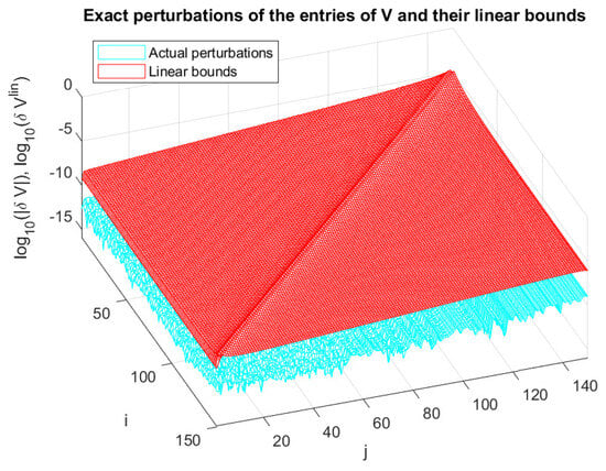 In Figure 20, Figure 21 and Figure 22, we show the entries of the matrix , the absolute values of the exact changes of all 150 singular values, and the entries of the matrix , respectively, along with the corresponding componentwise estimates , , and . The computation of the linear bounds requires the solution of a system of linear equations for and y and equations for . The nonlinear bounds of and are found only for 7 iterations and are visually indistinguishable from the corresponding linear bounds. The perturbation bounds derived were also tested with higher-order examples, including a example.