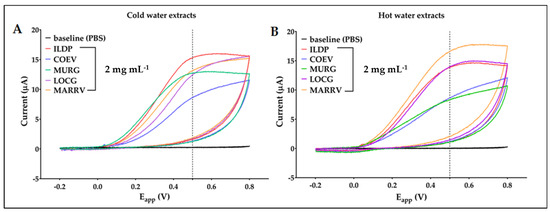 Cyclic voltammetry, with a scanned potential range (Eapp) comprised between −0.2 V and +0.8 V vs. carbon pseudoreference, in the absence (PBS black line) and in the presence of 2 mg mL−1 of MURG (green line), LOCG (purple line), ILDP (red line), COEV (blue line) and MARRV (yellow line) CP cold water extracts (A) and hot water extracts (B).