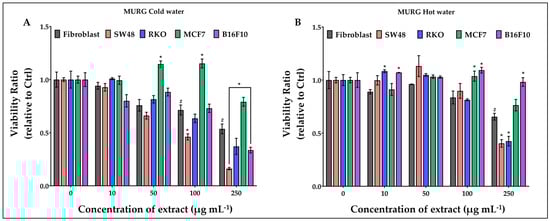 The MURG cold water extract (Figure 2A) significantly reduced the viability of fibroblasts starting from 100 µg mL−1 up to a reduction of 46% at 250 µg mL−1. Treatments became effective reducing the viability of SW48 at 100 µg mL−1 and, at the highest concentration, reduced the viability of RKO and B216F10; differently they increased the viability of MCF7 starting from 50 µg mL−1. The hot water extract (Figure 2B) appeared less effective both on fibroblast and cancer cells but increased the viability of B16F10 at 100 and 250 µg mL−1.