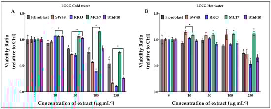 Effect of growing concentrations (from 10 to 250 µg mL−1) of LOCG cold (A) and hot (B) CP extract on viability of normal cells (fibroblasts), and of colon (SW48 and RKO), breast (MCF7) and melanoma (B16F10) cancer cells. # = p ≤ 0.01 vs. Ctrl; * = p ≤ 0.01 vs. fibroblasts.