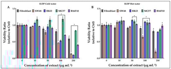 Treatments with cold and hot ILDP extracts (Figure 4) did not appear to have a particular efficacy on fibroblasts, except for the cold ones at 250 µg mL−1 (−41% of viability). Differently, the cold water extracts (Figure 4A) seriously reduced the viability of SW48 and RKO starting from 100 µg mL−1, while significantly increased that of MCF7 starting from 10 µg mL−1. The effect of hot water extracts was limited to SW48 cells (Figure 4B).