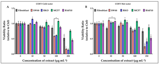 Treatments with cold and hot water COEV extracts affected the viability of fibroblasts at 100 and 250 µg mL−1, respectively (Figure 5). The same concentrations of cold water extract significantly reduced the viability of colon cancer cells (Figure 5A) and slightly increased that of MCF7; the hot water extract was effective also on B16F10 (Figure 5B).