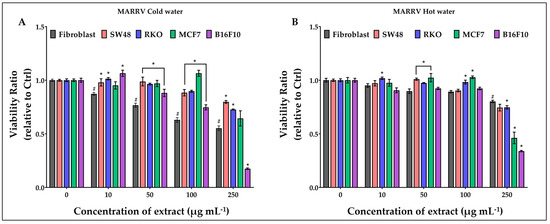Effect of growing concentrations (from 10 to 250 µg mL−1) of MARRV cold (A) and hot (B) CP extract on viability of normal cells (fibroblasts), and of colon (SW48 and RKO), breast (MCF7) and melanoma (B16F10) cancer cells. # = p ≤ 0.01 vs. Ctrl; * = p ≤ 0.01 vs. fibroblasts.