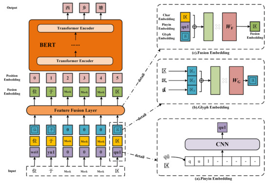 - Sun, Z.J.; Li, X.Y.; Sun, X.F.; Meng, Y.X.; Ao, X.; He, Q.; Wu, F.; Li, J.W. ChineseBERT: Chinese Pretraining Enhanced by Glyph and Pinyin Information. In Proceedings of the 59th Annual Meeting of the Association for Computational Linguistics and the 11th International Joint Conference on Natural Language Processing, Bangkok, Thailand, 1–6 August 2021; pp. 2065–2075. [Google Scholar]