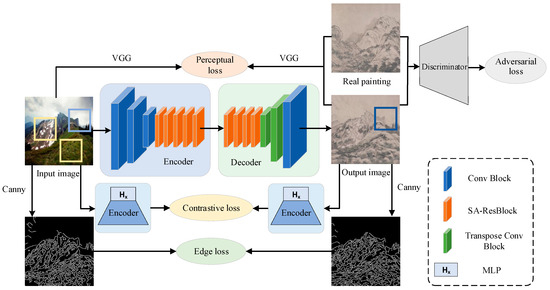 The structure of the constructed Paint-CUT is shown in Figure 1. The main improvements are as follows: (1) Chinese landscape painting emphasizes layout and composition. In order to solve the problem of detail loss and maintain the texture details of the scenery, shuffle attention (SA) [23] is added to the residual blocks of the CUT generator. And then, the SA-ResBlock is constructed, which can better capture the main features of landscape photos and effectively extract the detailed features of photos. (2) In order to solve the problem of poor style transfer and ensure a generated landscape painting with a similar style to the target landscape painting, the pre-trained VGG is used to extract the content and style features to calculate the perceptual loss. (3) In order to solve the problem of blurred outlines, the Canny edge detection is used to generate edge maps. And then, the edge loss is calculated to constrain the model to generate landscape paintings with clear outlines and modeling. Finally, the landscape paintings generated by Paint-CUT have clear outlines and structure, rich details, and realistic style.