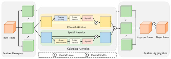 At present, attention mechanisms can be mainly divided into two categories: spatial attention and channel attention, which capture pixel-level relationships and channel dependencies, respectively. The combination of them can perform better but will increase the computational costs. Shuffle attention (SA) [23] can efficiently combine spatial attention and channel attention to communicate information between different sub-features. The SA module is shown in Figure 2. The first step is feature grouping; the input features are divided into G groups along the channel dimension and, then, the sub-features of each group are processed in parallel. In the second step, the features of each group are evenly divided into two branches along the channel dimension. The attention weights are computed from the channel and spatial dimensions, respectively, and, then, the two branches within each group are concatenated. After that, all the sub-features are aggregated. Finally, the channel shuffle is used to recombine sub-features between different groups by channel dimension, which can promote the exchange of information between different channels. So, the diversity and expressiveness of the features can be enhanced.
