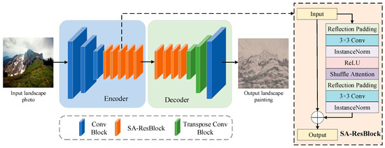 Chinese landscape paintings contain various scene information. The generated landscape paintings often lose details of scenes, such as rock texture. The residual blocks in the CUT generator can reduce the loss of features. Meanwhile, the SA can use spatial and channel attention in parallel and combine the two types of attention, which can be introduced to focus on relevant scene information. Therefore, the SA is introduced into the residual blocks in the CUT generator to construct the SA-ResBlock, which is used to enhance the generator’s ability to extract the main scene information and texture features. Specifically, the generator of Paint-CUT consists of an encoder and a decoder, which is shown in Figure 3. The encoder consists of three convolution blocks and five SA-ResBlocks and the decoder consists of four SA-ResBlocks, two transpose convolution blocks, and one convolution block. The landscape photos are input into the generator and the content and structural features of photos are extracted by downsampling based on convolution blocks in the encoder. Then, the extracted features are input into the SA-ResBlock to further combine different features of landscape photos. Since the residual block can reduce the vanishing gradient, after adding SA, the features can be filtered purposely to reuse the useful features. After that, the features are input into the SA-ResBlocks in the decoder and the detail features are recovered and enhanced, which solves the problem of detail loss. Finally, the output features are upsampled by using transpose convolution blocks and input into a convolution block to generate the landscape paintings. After the above operations, the generated landscape paintings can better maintain the content and structure features of the input landscape photo and have rich details.