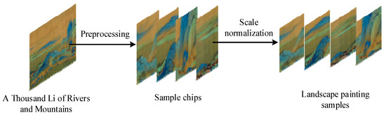 In order to better study the intelligent generation of Chinese landscape paintings, we train and test the proposed Paint-CUT on the constructed landscape painting dataset. This dataset includes landscape photo samples, as well as two of the top ten painting samples, i.e., the samples of Dwelling in the Fuchun Mountains and A Thousand Li of Rivers and Mountains. In order to generate high-quality results, a series of processing methods are applied to the samples. The construction process of landscape painting samples, using A Thousand Li of Rivers and Mountains as an example, is shown in Figure 4. Landscape photos cover various elements, such as mountains, water, trees, rocks, and houses, which are common and represent elements of Chinese landscape paintings. These photos are consistent with the Chinese landscape paintings in content, which can be used to generate landscape paintings. The size of the sample is 256 × 256, including 5388 samples of Dwelling in the Fuchun Mountains, 5025 samples of A Thousand Li of Rivers and Mountains, and 3253 landscape photos. In addition, the entire dataset is randomly divided into a training dataset (80%) and a test dataset (20%). A detailed overview is shown in Table 1. This dataset can satisfy the requirements of experiments; examples of samples are shown in Figure 5.