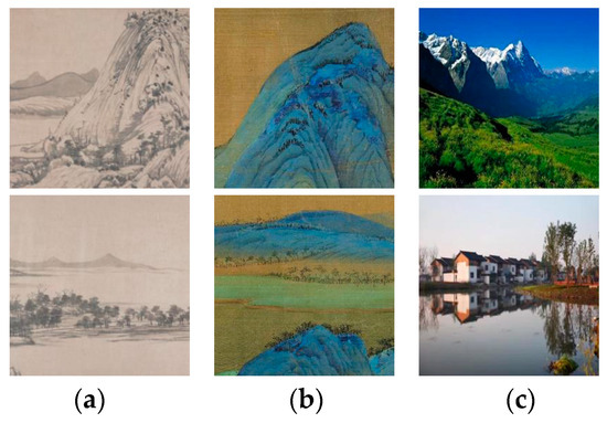 Samples of the constructed dataset ((a) is the samples of Dwelling in the Fuchun Mountains, (b) is the samples of A Thousand Li of Rivers and Mountains, and (c) is the landscape photo samples).