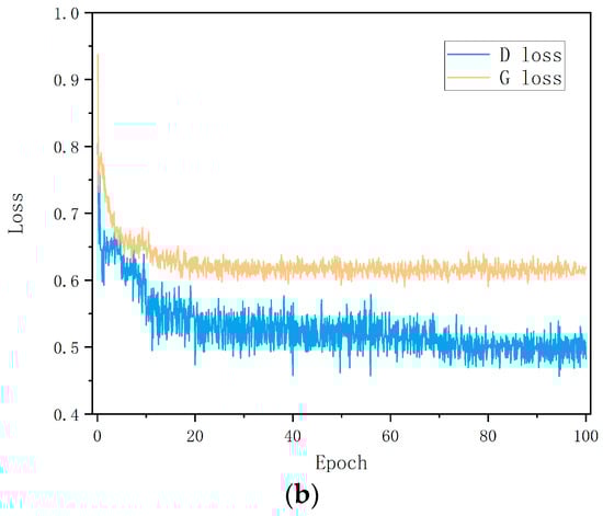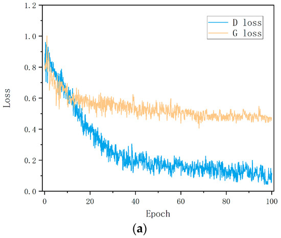 The experimental environment is listed as follows: Linux system 4.18.0, Pytorch framework 1.8.0, and NVIDIA GeForce RTX 3080Ti 12GB GPU, which is manufactured by NVIDIA in Santa Clara, CA, USA. Hyperparameter tuning is the process of selecting the optimal hyperparameters for the model. Hyperparameters are tuned to generate better results in different datasets. During the model training, hyperparameters are set as follows: the size of all input samples is 256 × 256, the batch size is 1, and the number of Epochs is 100. The Adam optimization algorithm is used to update the weights. The constructed landscape painting dataset and ChipPhi dataset are selected to train models, respectively. The initial learning rate is set to 0.0001, 0.00015, and 0.0001 for the samples of Dwelling in the Fuchun Mountains, the samples of A Thousand Li of Rivers and Mountains, and the ChipPhi dataset, respectively. However, generative models are difficult to train and challenges, such as model collapse and vanishing gradient, may be encountered during training. In order to demonstrate the dynamic changes in the model training, the loss curves with Epochs of the generator and discriminator on both datasets are shown in Figure 6. The model has converged when the curve has stabilized. Taking the training process of samples (i.e., Dwelling in the Fuchun Mountains) shown in Figure 6a as an example, we can observe the loss curve during training. When the Epoch is small, the generator loss (G loss) function oscillates violently and decreases rapidly. As the Epoch continues to increase, the amplitude of the generator loss function gradually decreases and eventually stabilizes. When the Epoch is small, the discriminator loss (D loss) function also decreases rapidly. As the Epoch continues to increase, the discriminator loss function still tends to stabilize. The loss curve of the ChipPhi dataset shown in Figure 6b also follows a similar trend. In conclusion, with the increase in training Epochs, the proposed Paint-CUT can rapidly tend to a stable state.