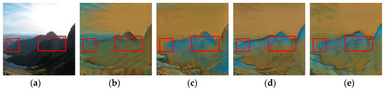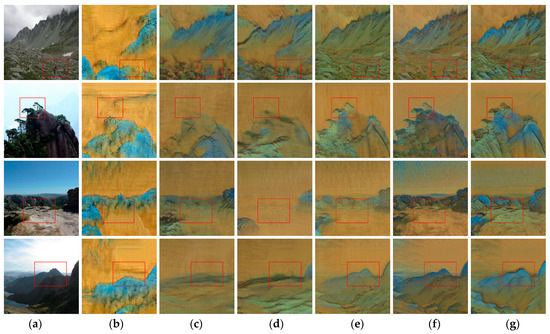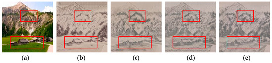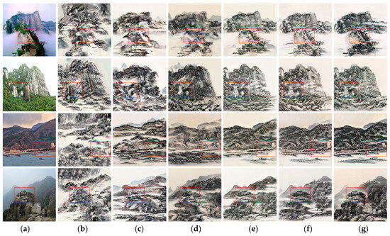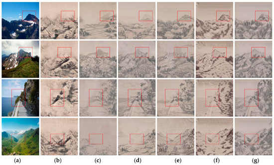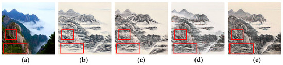 In addition, ablation experiments on the ChipPhi dataset are conducted to demonstrate that the SA, perceptual loss, and edge loss in the proposed Paint-CUT are equally necessary for generating landscape paintings on different datasets. The ablation experiment results on the ChipPhi dataset are shown in Figure 12. The generated landscape painting of CUT in Figure 12b is similar to the content of the input landscape photo. But, as shown in the red box, the generated result has some missing parts in mountains and the overall color of the painting is weak. The SA can capture detailed features of the main regions in photos. As shown in the red box in Figure 12c, after adding the SA, the vacancy of mountains is generated and the texture details are richer; however, there are still some details missing. The perceptual loss (Lper) can better constrain the content and style information of the generated landscape paintings. As shown in the red box in Figure 12d, after adding the perceptual loss (Lper), the missing part in the mountains is recovered and the generated landscape painting has richer details. However, some textures and lines are still missing. The edge loss (Ledge) can constrain the line information of landscape paintings; the generated results have clearer outlines and richer details. The proposed Paint-CUT is finally constructed after adding the edge loss (Ledge). As shown in the red box in Figure 12e, the outlines of mountains become clear and the whole painting is highly similar to the content of the input landscape photo. In a word, based on the proposed Paint-CUT, the ablation experiments in Figure 12 prove that the generated landscape paintings retain the content of photos and have a similar style to the target landscape paintings, which improves the generation quality.