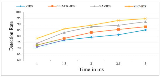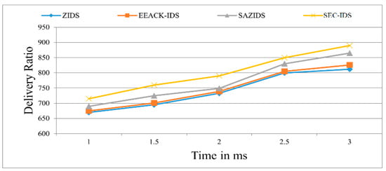 Figure 2 demonstrates the superior performance of the proposed SEC-IDS system in accurately identifying attacks when compared to existing detection strategies like ZBIDS, EEACK-IDS, and SAZIDS. SEC-IDS showcases a 3.45% improvement by delivering the content with a ratio of 900 in 3 ms, which is a massive improvement over SAZIDS, a significant 12.14% enhancement over the current ZBIDS strategy, and an 8.28% higher detection rate than EEACK-IDS. Similarly, we also evaluated the detection rate and compared with existing approaches as shown in Figure 3.