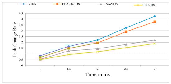 Figure 5 illustrates the assessment of the link change rate, revealing that SEC-IDS adeptly reduces this rate when compared to the established methods of ZBIDS, EEACK-IDS, and SAZIDS. SEC-IDS showcases a significant 16.16% improvement over SAZIDS, a substantial 45.8% enhancement over ZBIDS, and a notable 44% better performance than EEACK-IDS.