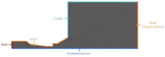 Figure 2 shows the numerical model of a submerged cavitating jet. The simulation area included the internal flow field of the nozzle and the external water environment domain. Since the nozzle itself is a rotational structure, a two-dimensional axisymmetric model was used to save the calculation time under the premise of ensuring the accuracy of the simulation. The pre-processing software Mesh 19.0 was used to mesh the model. The pressure-inlet was selected, and the gauge total pressure was established at 30 MPa. By utilizing the Bernoulli equation (Equation (6)), the Reynolds number equation (Equation (7)), and the turbulence intensity calculation equation (Equation (8)), the turbulence intensity at the inlet can be determined as 5%.