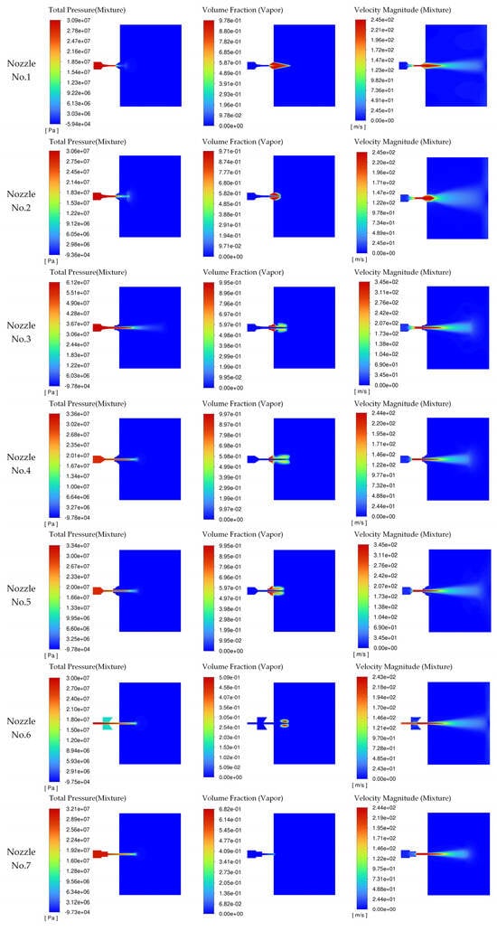 Similar to the submerged free jet which was identified to have 3 distinct regions of flow: the undisturbed region of flow, the potential core region and the fully developed region [45,46,47], the cavitation jet also has 3 regions: the growing region, the shedding region, and the collapsing and diffusing region [48]. The damage to the target is mainly caused by the last region. The contours of pressure (mixture), volume fraction (vapor), and velocity for each nozzle, obtained through simulation results, are presented in Figure 3. The cavitating jet’s cleaning effect primarily manifests in two forms: erosion due to water flow impact and denudation resulting from bubbles collapse. The velocity contours and pressure (mixture) contours in the simulation results indicate the extent of erosion caused by water flow impact, while the volume fraction (vapor) contours reveal the degree of denudation induced by bubbles collapse.