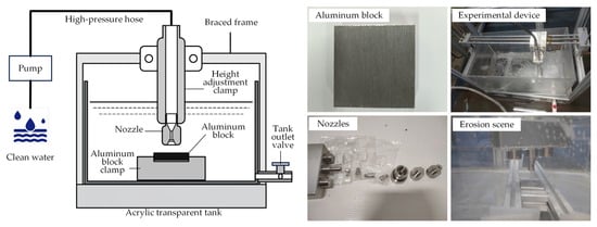 In order to verify the practical performance of each nozzle, an erosion experiment was designed, and pure aluminum blocks were used as the objects for erosion, as shown in Figure 4. The nozzle was connected to the high-pressure hose, and the high-pressure water impacted the aluminum block after cavitation through the nozzle. The nozzle was fixed on the height adjustment clamp through which the height of the nozzle could be adjusted to achieve different standoff distances. The aluminum block was fixed by a clamp to avoid moving. Both the aluminum block and the nozzle were submerged in the water tank during the experiment. The output pressure of the pump was constant at 30 MPa during the experiment; that is, the water flow into the water tank was constant. By adjusting the tank outlet valve, the water outflow could be adjusted to be the same as the water inflow, therefore all nozzles were always at the same water depth, removing the influence of water pressure difference caused by different water depths on the actual effect of cavitating jet. The optimal standoff distance of the nozzle is between 30 mm and 50 mm [49,50]. In order to compare the performance under different standoff distances, two groups of experiments were designed. For the first group, the aluminum blocks were eroded by the seven nozzles listed in Table 1 for ten minutes at a standoff distance of 30 mm, and three nozzles with better erosion effect were selected. The selected three nozzles form the second group, and the experiment was conducted at a standoff distance of 50 mm. The aluminum block was weighed before and after the experiment and the masses were recorded.