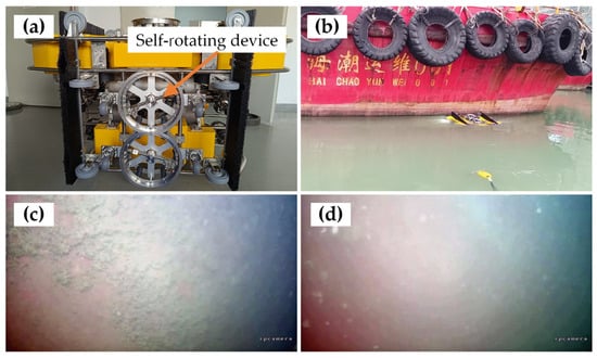(a) The self-rotating cleaning device was installed onto the underwater cleaning robot; (b) the underwater cleaning robot cleaning the ship’s hull; (c) the ship’s hull before cleaning; (d) the ship’s hull after cleaning.
