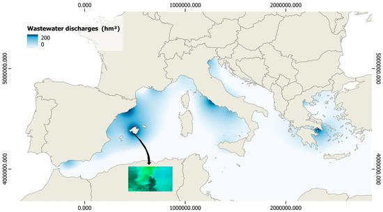 The global characteristics of the Mediterranean Sea (from southern Spain to Greece) features a hot and dry climate and a closed marine environment with high seawater evaporation. The fluvial system consists of few long rivers and numerous short channels active during intense rainfall. Bathymetry indicates a regular decrease in seabed elevation from −1 to −100 m [2]. These factors intensify the impact of pollutants compared to more open seas. Wastewater discharge points, in heavily populated tourist areas along the coast, significantly contribute to the pollution in the Mediterranean Sea. Many discharge points are located between 10 and 25 m deep, extending up to 1 km offshore, leading to a substantial volume of poorly treated or untreated wastewater being discharged due to limited treatment plant capacity.