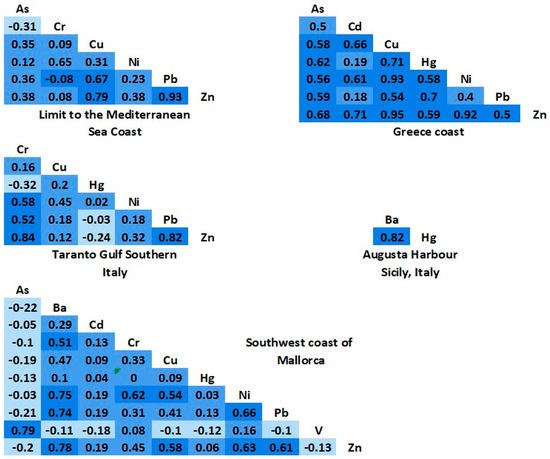 The correlation matrices (Figure 2) reveal predominantly positive relationships among heavy metals, with specific exceptions like As-Cr in the M-A limit (southeast of Spain) and Hg-Zn in the south of Italy (Gulf of Taranto). However, Mallorca (southwest of Spain) exhibits a unique pattern with positive correlations among As and V but negative correlations with other heavy metals. The enrichment of As and V may be linked to nitrogenous fertilizer discharges and coastal aquifer pumping systems. Matrices compare study areas, excluding anomalous values from punctual discharges in northern Greece and southern Italy.