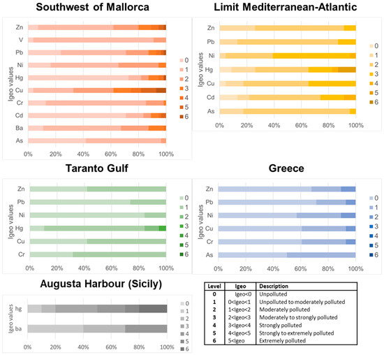 Mallorca stands out for Ba, Cr, Pb, and Zn; Greece for Cr, Ni, Pb, and Zn; M-A limit for Cu, Ni, Pb, and Zn; southern Italy for Cr, Cu, Ni, Pb, and Zn. The pollution ranking, based on Igeo classes, is as follows: