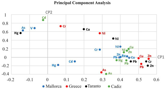 PCA loading plot for the studied heavy metals in the southwest of Mallorca. PC1 and PC2 account for 3.76% and 19.72% of the variance, respectively.