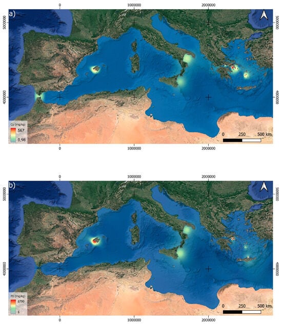 The distribution of pollution in the Mediterranean Sea demonstrates high agreement (Figure 5 and Figure 6). This clear correlation is because zones near the coast in densely populated areas are points where poorly purified waters with high concentrations of heavy metals are discharged into the sea. Moreover, because the cause of most pollution appears to be common, some heavy metals seen in higher concentrations are common between these areas. Occasionally, certain regions in southern Italy and northern Greece show anomalously high concentrations in some heavy metals, which are attributed to discharges from the metallurgical or mining industry [24]. Most areas with significant pollution values are linked to poorly treated wastewater discharges near the coast, particularly in regions experiencing seasonal overpopulation during Mediterranean summers. Increased tourist pressure in these areas renders it challenging to treat the water consumed by visitors. As depicted in Figure 5, the distribution and concentration of Cu, Pb, Hg, and Zn in the central-northern Mediterranean reveal a similar spatial pattern, with the highest values near coastal areas where wastewater discharges occur.