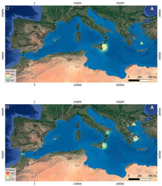 Maps of pattern of (a) Cu, (b) Pb, (c) Hg, and (d) Zn distribution in the Mediterranean according to the database of the analyzed regions.