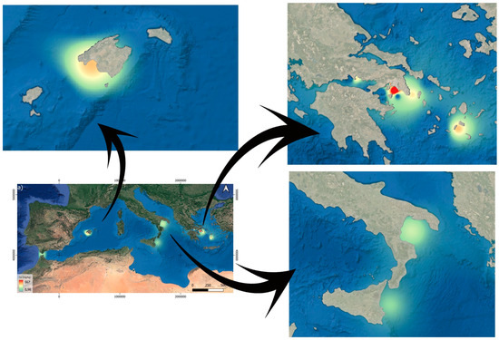 The seabed of areas of the Mediterranean Sea studied is mainly composed of sand (<80%) and small amounts of fine sediments, silt, or clay <20%. Gravel-sized sediments there are not abundant and, like clays, are generally deposited in the zones closest to the littoral coasts [2]. These factors, as well as bathymetry, intensify the impact of pollutants compared to more open seas. Wastewater discharge points in heavily populated tourist areas along the coast significantly contribute to the pollution in the Mediterranean Sea. Many discharge points are located between 10 and 25 m deep, extending up to 1 km offshore, leading to a substantial volume of poorly treated or untreated wastewater being discharged due to limited treatment plant capacity (Figure 1). The evaluation and review of marine sediment contamination was based on the regional background level inferred from uncontaminated sands and was compared with global contamination indices [2,36,37,38]. Statistical methods and spatial distribution analysis were applied to each area.