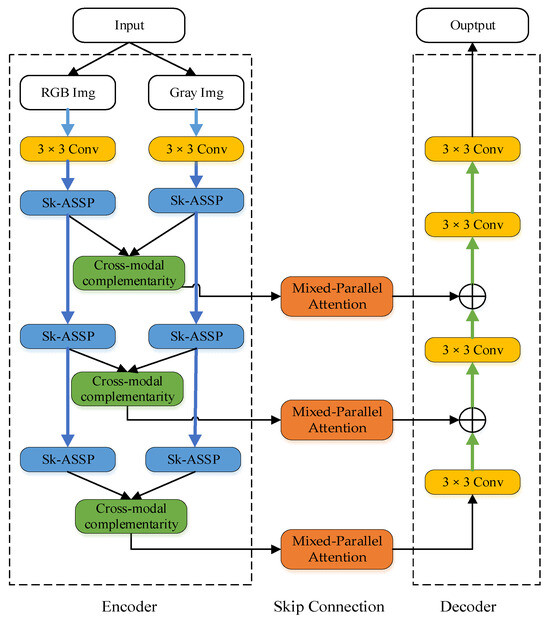 The encoder part consists of two branches: RGB image input and gray image input. Each image input in two modalities will firstly go through a 3 × 3 convolution to obtain the shallow features in the two modes. After that, three consecutive down-sampling operations are carried out: First, the SK-ASSP module is entered to obtain the feature map under the corresponding mode, and then the output of the two branches of RGB and gray level is entered into the cross-modal complementarity module for feature fusion to obtain the result of this layer of down-sampling. After a total of 3 down-sampling operations, enter the decoder for up-sampling operations.