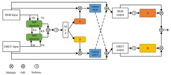 Different modes of the same image focus on different features. RGB mode focuses on the image’s color and texture features, while gray mode focuses on the image’s brightness, structure and shape features. In order to make the feature maps extracted from the two branches of RGB image and grayscale image complement each other with information, so as to carry out cross-mode feature fusion, this paper makes improvements based on the CMF module (cross model fusion) [25], and proposes the following cross-mode complementary module, whose structure is shown in Figure 4.